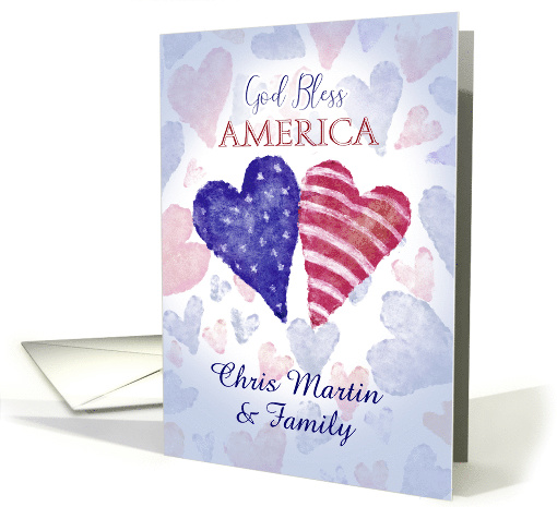 | Artist Notes: | Blue Hearten with stars and Red Hearten with white lines shows American Flag with many Heartens in background in Red and Blue with Text God Bless America in top. Custom Name in Card Front. |