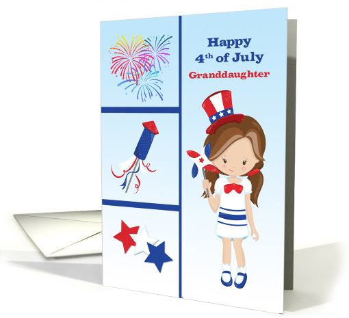 A 4th of July greeting for Granddaughter features a cute brunette girl wearing a patriotic hat and holding a pinwheel. On the side is a montage of fireworks and stars.