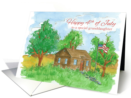 Artist Notes: | Happy 4th of July greetings to a special granddaughter featuring a quiet patriotic country home with a flag gently blowing in the wind on a summer day illustrated with watercolor. |