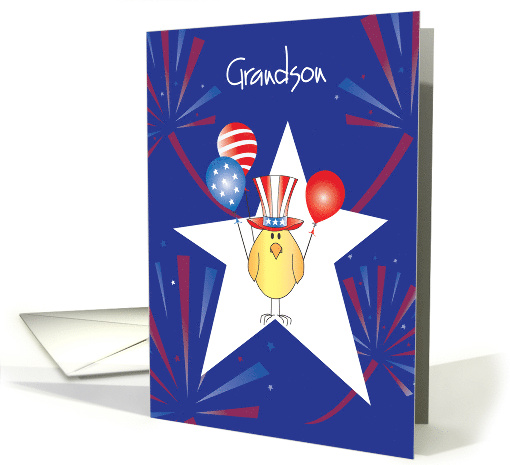 This 4th of July card for your grandson has a yellow bird standing at the center of a huge white star. He's patriotic and wears his tall red and white striped Uncle Sam hat for the holiday. He also holds three balloons in his wings, one solid red, one blue with white stars and one red and white striped. Behind him patriotic fireworks explode in colors of red and blue, on the dark blue background. At the very top of the card is the white hand lettered word "Grandson". The inside wording of the card says "Happy 4th of July to a wonderful grandson, with lots of love!"