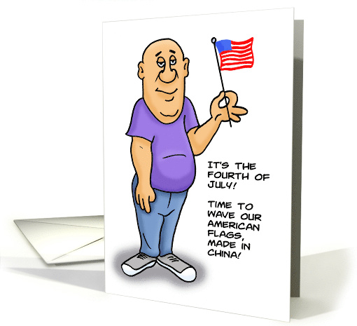 | Artist Notes: | Humorous Fourth of July card with a retro style cartoon man holding a small flag. The words say: It's the fourth of july! Time to wave our American flags, made in China! Inside says: Happy Independence Day |