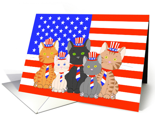 | Artist Notes: | A quintet of diverse patriotic cartoon kittens wearing red white and blue neck ties and hats sitting in front of an American flag looking directly at viewer. Purr-fect Happy Fourth of July greeting for your feline loving friends and/or family |