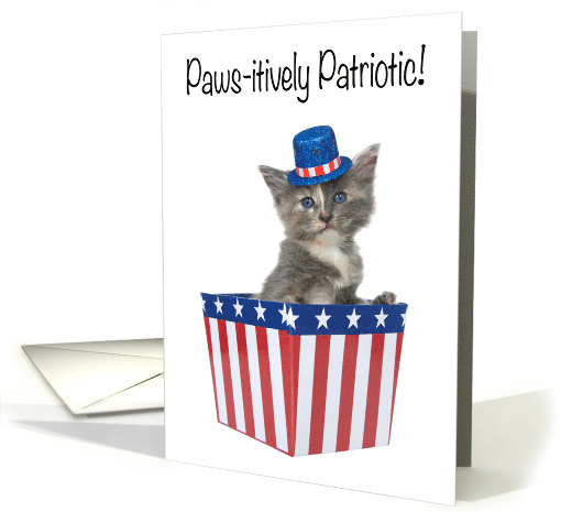 | Artist Notes: | Adorable punny happy 4th of July greeting with a diluted tortie kitten in a patriotic box wearing a top hat sending holiday greetings. Purr-fect for the patriotic cat loves in your life. |
