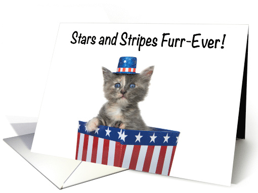 | Artist Notes: | Adorable diluted tortie kitten sitting in red white blue stars and stripes box wearing a top hat sending patriotic 4th of July holiday greetings. Purr-fect for the patriotic cat loves in your life. |