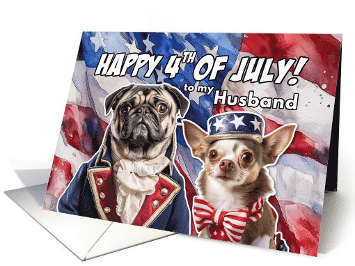 | Artist Notes: | A patriotic pug and chihuahua are dressed in stars and stripes on a grungy American flag watercolor background with the text 'Happy 4th of July to my husband'. The perfect celebrational card to send to your love for the birthday of America. |