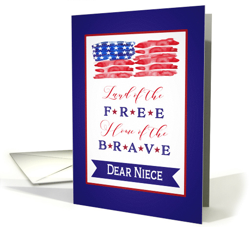 Artist Notes: | Trendy look in red, white and blue - an elegant Fourth of July card for your niece. Watercolor swashes and elegant script font. You can customize message inside. |