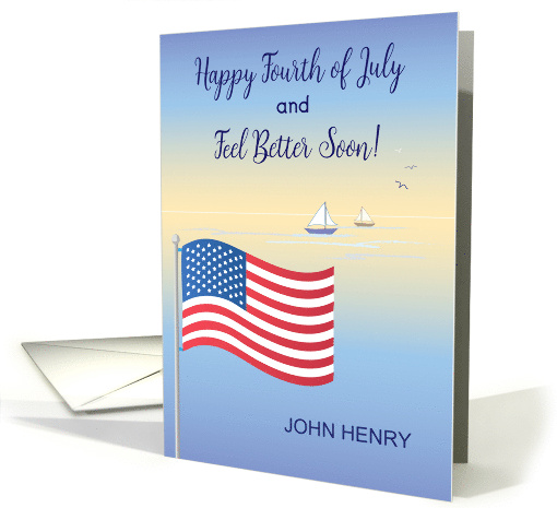 | Artist Notes: | This is a custom name get well card for someone who is ill over the 4th of July. The cover features a sky and water background, two sailboats, flying birds, an American flag, and a dark blue headline. The personal name is placed at the bottom of the card. You may change the inside message, if you wish. ©Gail Pepin |