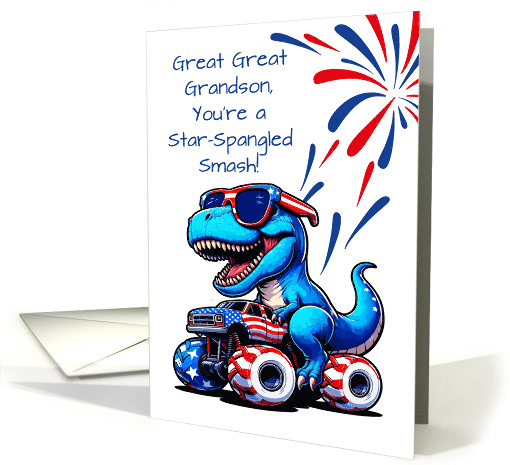 | Artist Notes: | Celebrate the Fourth with your great great grandson in style! This fun and festive card features a blue T-Rex riding a monster truck decked out in stars and stripes. With fireworks and a bold message, it’s just right for a great great grandson who’s full of life and patriotic fun. |