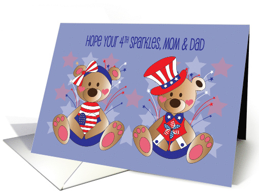 | Artist Notes: | Your Mom and Dad will be delighted to receive this 4th of July card, with its bright fireworks and cute patriotic couple who are dressed in their red, white and blue for the holiday. The boy bear is wearing his Uncle Sam hat, while the girl bear has a huge red and white striped bow on her head. The wording, at the top of the card, says "Hope your 4th sparkles, Mom and Dad". The card's inside wording says "Have a wonderful Fourth of July that explodes with happiness." |