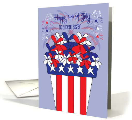 | Artist Notes: | Wish your sister a happy 4th of July with this fun patriot red, white and blue flower pot that is overflowing with red, white and blue summer flowers. Fireworks of the same colors explode in the background, behind the flower pot. Hand lettered, in blue, above the flowers, are the words "Happy 4th of July - to a Dear Sister". Several red, white and blue stars fill the background also. The inside wording of the card says "Hope your holiday explodes with happiness!" |