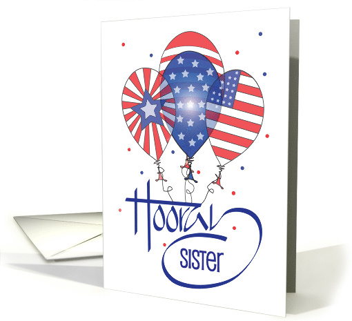 "Hooray" is large blue hand lettered word that curls and swirls around the bottom of this white Fourth of July card for your sister. Tied to the top of the bar that crosses the letter "H" are three very patriotic red, white and blue inflated balloons. Each has a different design, one has radiating stripes of red and white with a central blue star, another looks very similar to our American flat and one is blue covered with white stars. Additional wording, in the tail of the letter "Y" is the word "Sister". The inside wording of the card says "Wishing you a very happy 4th of July!"