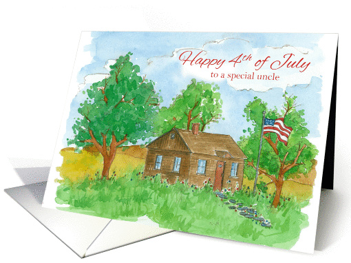| Artist Notes: | Happy Fourth Of July to a special uncle greeting card decorated with a patriotic cabin country landscape painting with a flag in the front yard painted in watercolor. |