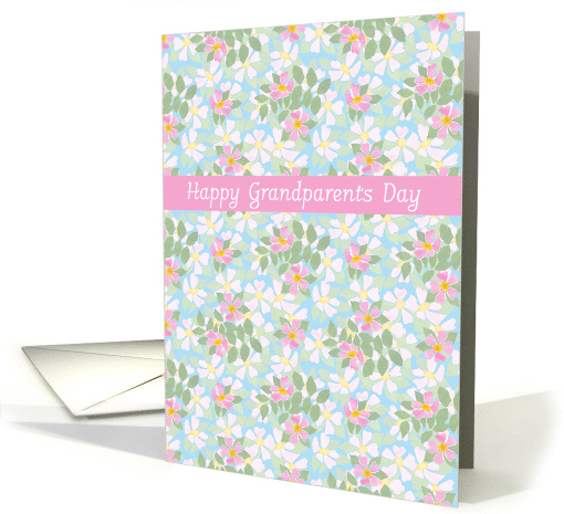 | Artist Notes: | A chic Grandparents Day Card with a pretty, nostalgic pattern of pink Dog Roses on a sky blue background; from a digital capture of a hand painted paper collage pattern by Judy Adamson. The front cover greeting is, 'Happy Grandparents Day' in white lettering on a pink strip across the pattern. |