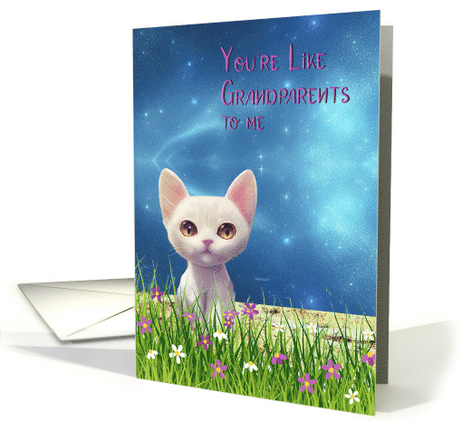 Let the people you love as grandparents know how much you love them. This image shows a cute white cat sitting in the grass filled with purple and white flowers. This adorable white kitty cat shows a background of a deep blue sky.