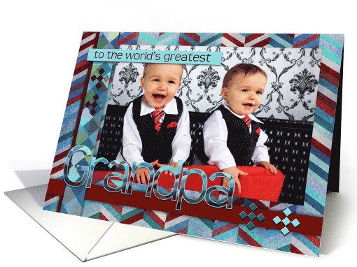 | Artist Notes: | A customizable Grandparent's day card in a scrapbook style. Chevron, zig zag and geometric style digital "paper", in shades of blue, brown, rust, teal and red make a frame for your photograph, with text which reads: To the world's greatest Grandpa. A cute and trendy card for a special Grandfather. |