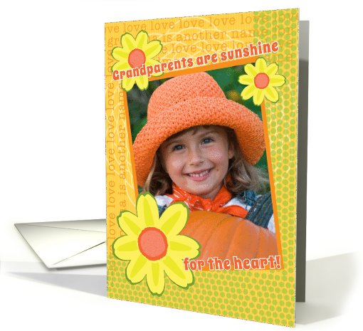 | Artist Notes: | This sunny, scrapbook style card for grandma and grandpa on Grandparents Day features yellow and orange daisy flowers and the phrase, "Grandparents are sunshine for the heart!" Add a special photo to the cover and your personal message inside to create a wonderful keepsake sure to be treasured. |