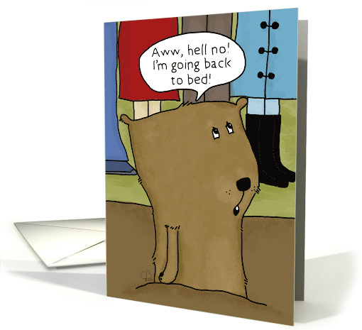 ©Christie Black. Funny groundhog cartoon of groundhog standing at the entrance of his hole seeing all the people standing around and gives a few choice words and decides he is going back to bed. Happy Groundhog day.