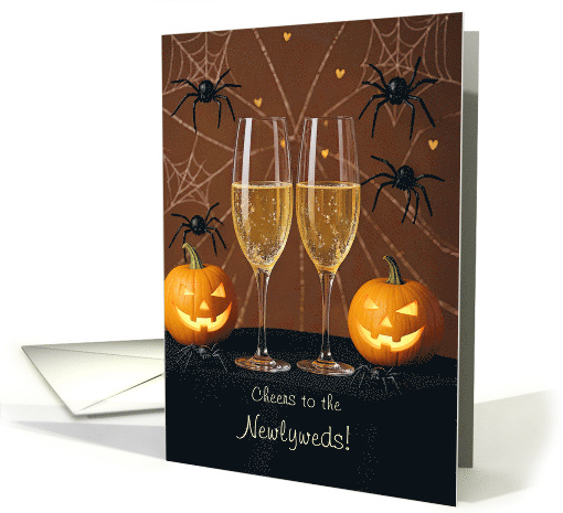 Cheers to the newlyweds on their first Halloween as a married couple. A cute and festive image of champagne flutes and spiders.