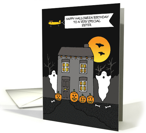 An illustration of a spooky haunted house at night, complete with bats, ghosts, bones and pumpkin lanterns. A plane is flying over the house with a banner behind it. The banner says 'Happy Hallowwen Birthday to a very special sister'.