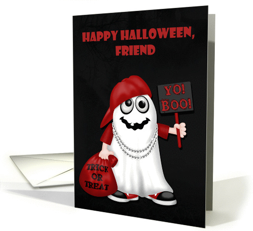 Halloween to Friend, Rapper ghost with a bag of treats holding sign