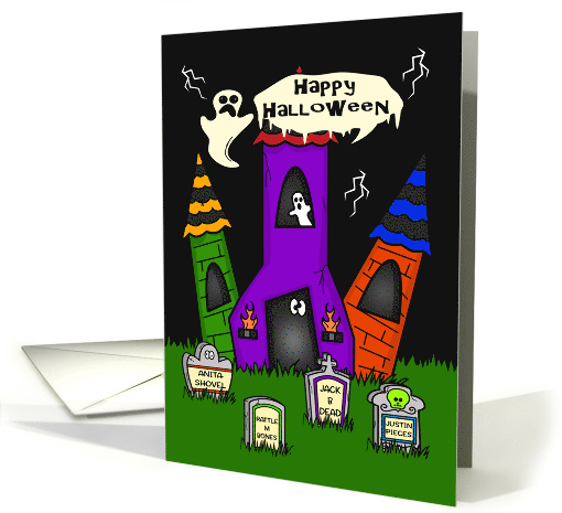 Halloween Card with a Spooky House and Humorous Tombstones