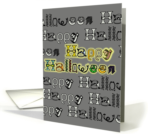 Happy Halloween greeting spelt out in fun, colorful letters which also emit a soft yellow glow. The greeting is repeated in rows, with the letters colored in light grey and outlined in black. The background is a darker shade of grey.
