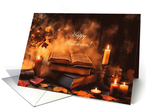 A mystical magical Happy Halloween card with all the enchantment of the holiday. Vintage spellbooks with pages open, surrounded by mist and candles.