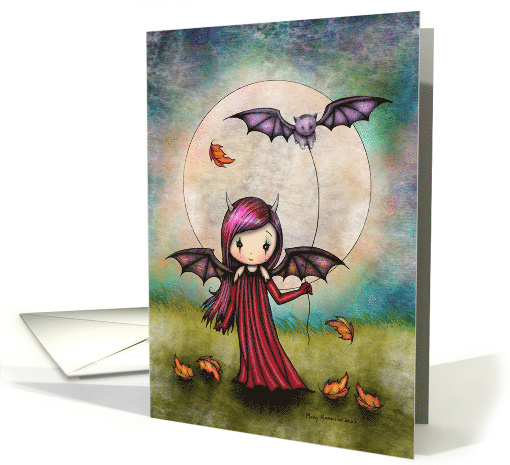 "Little Vampire with Flying Cat" © Molly Harrison 2022 This is an illustration I drew originally for a coloring book and painted digitally. A cute little vampire girl is enjoying meandering among the valley on a Halloween night with her flying pet kitty among a full moon.