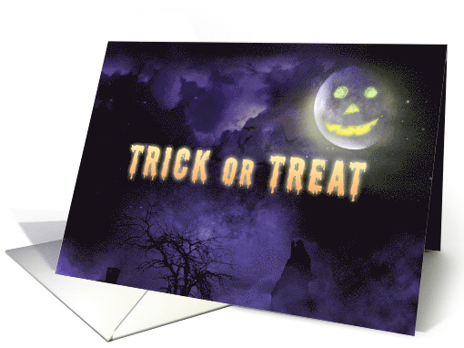 A Bright and spooky Look of Moon as a Jack O' Lantern on Halloween night, capturing the feel of Halloween fright. Blue and Warm Text "Trick or Treat" gives various contrast feel in card front. A funny way to wish someone fun this Halloween with this hope it's a hoot card.