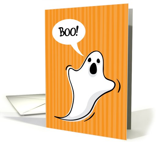 Cute cartoon ghost saying Boo! Orange Background. Text inside: Happy Halloween! Change the to suit your needs.