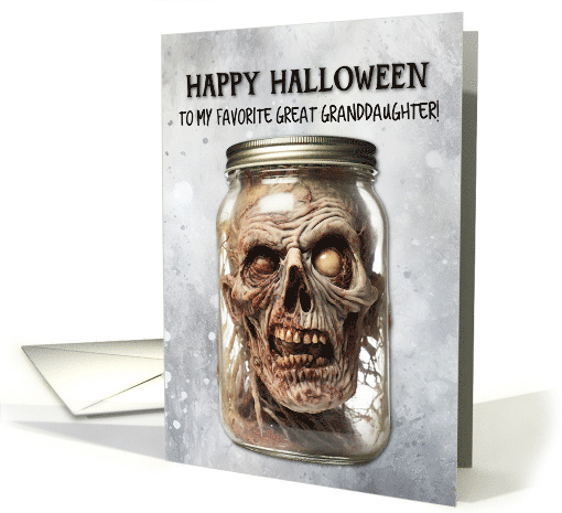 | Artist Notes: | A ghastly zombie head in a jar on a grey watercolor grunge background with the text 'Happy Halloween to my favorite great granddaughter'. A super fun and creepy design to scare the pants of your great granddaughter for Halloween. |