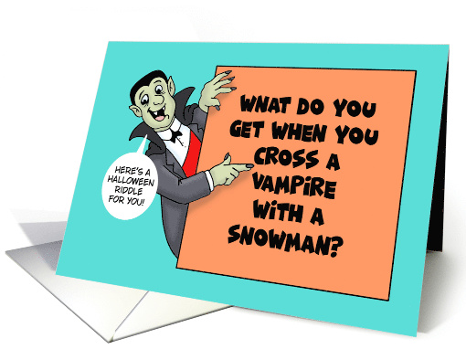 Humorous Halloween Card with a riddle, and with a cartoon Dracula character on a blue background. The words say: What do you get when you cross a vampire with a snowman? Inside says: Frostbite! Happy Halloween