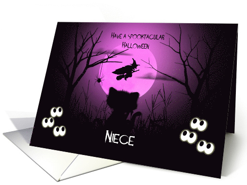 Have a spooktacular Halloween, Niece. Spooky shilouettes of a cat sitting in a dark corn field surrounded by scary eyes peering from the dark. A black shilouette of a witch that is flying in front of a purple glowing moon with tree shilouettes and a black spider coming down from the tree. Inside message says: May your Halloween be frightfully fun!
