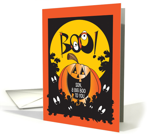 Your Son will chuckle when he sees this card's huge mouthed orange pumpkin jack o' lantern, who is snuggled down into the spooky leaves at the bottom of the card. All around him, pairs of snooping eyes are oogling the pumpkin, from the dark. Over the pumpkin's head, a large round full moon of yellow, fills the top of the card, filled with the hand lettered word "Boo!" The two letters "O" in the word overlap, in colors of black and orange, creating another set of prying eyes. Written in the mouth of the jack o' lantern are the words "Son, a Big Boo to You". The wording on the inside of this must have card says "Happy Halloween, with lots of love!"