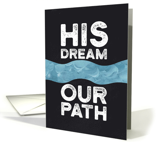 | Artist Notes: | His dream created a path toward equal rights. This bold card in his honor features INTENTIONALLY DISTRESSED chalkboard background and gritty typography. The path is symbolized by a stylized river rendered in a painterly background and cut out flowing shape. His dream: our path. |