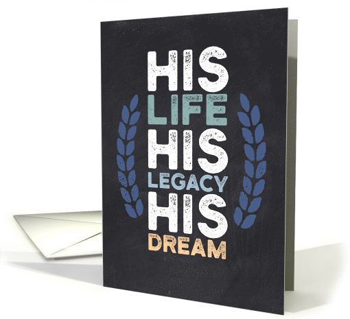 Artist Notes: | Distressed typographic elements highlight the word, "HIS" on the cover of this respectful Martin Luther King Day card. Black chalkboard background and muted masculine colors complete the message. Celebrate him and remember someone important in your life with this card. |