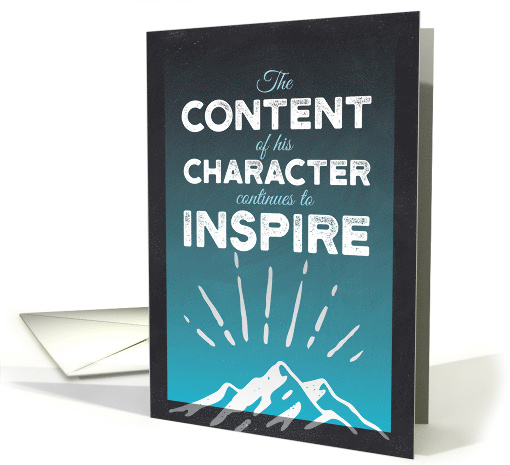 Artist Notes: | Honor the Reverend Martin Luther King Jr. and the recipient with this inspiring card. He urged us to judge others by the content of their character. His character continues to inspire others today. Distressed typography and bold colors and graphics convey strength and hope. |