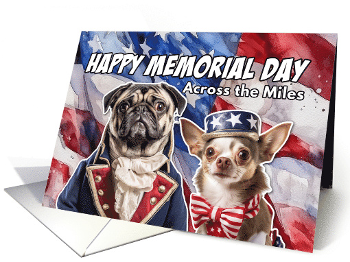 A Pug and a Chihuahua (part of the "Pug in a Suit" Series) in patriotic garb on a stars and stripes USA watercolor background with the text "Happy Memorial Day Across the Miles". A patriotic card to send to any red-blooded American for Memorial Day.