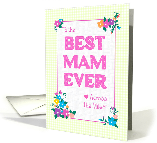 Artist Notes: | A pretty Mother's Day card for your mam The design has a yellow check gingham border surrounding the words, 'To the BEST MAM EVER Across the Miles', in magenta pink lettering on a lightly textured white background. There are bright clusters of multi-coloured flowers in the corners and a small magenta pink heart. The inside message can be customized or deleted if you wish. |