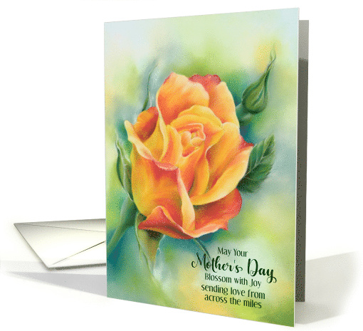 An enchanting rose with petals of vivid yellow accented in red and orange accompanied by green foliage rendered in soft pastel shades graces the cover of this card that may be customized to convey a Mother’s Day wish from across the miles.