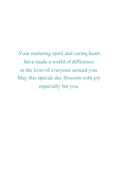 | Inside: | Your nurturing spirit and caring heart have made a world of difference in the lives of everyone around you. May this special day blossom with joy especially for you. |