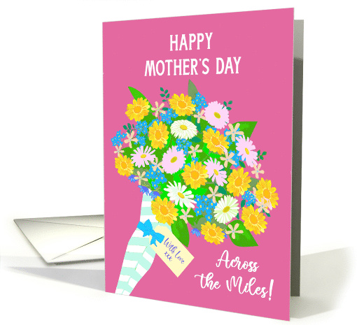 A pretty greeting card for someone far away on Mother's Day, with white and yellow chrysanthemums and blue forget-me-nots on a deep pink background. The front cover greeting, in white lettering is, 'HAPPY MOTHER'S DAY' at the top and 'Across the Miles!' in an informal handwriting script at the bottom. The bouquet of flowers is wrapped in aqua and white striped giftwrap and a label with 'With Love xxx' is tied with blue ribbon. The inside message is just a suggestion and yo can easily change it or delete it altogether.