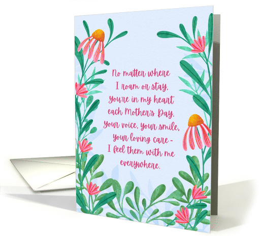 Artist Notes: | Fun abstract pink flowers and bright greenery form a border around a poem to send love to your Mom when you can't be with her on Mother's Day. |