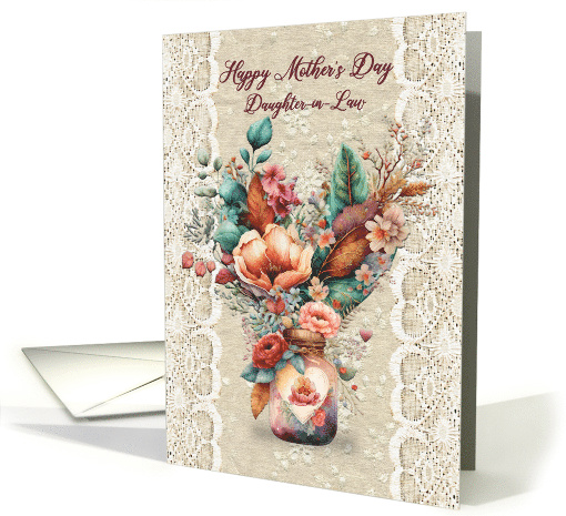 Your daughter in law will surely be delighted by this beautiful Mother's Day greeting. The design features a heart shaped bouquet of flowers in a jar with even more flowers. A lovely lace background adds an additional touch of pretty! THE LACE BACKGROUND IS A DIGITAL CREATION AND NOT ACTUAL LACE.