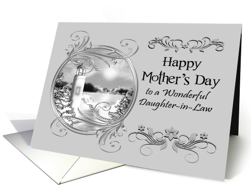 An elegant Mother's Day card addressed to a wonderful daughter-in-law. A beautiful lighthouse theme enclosed in a silver frame surrounded by gray accented with delicate silver elements with fancy text.