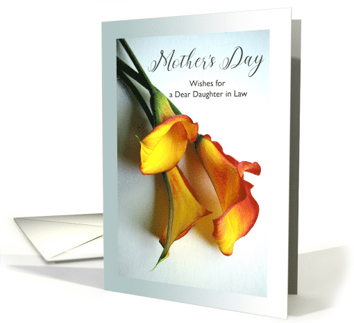 Mother's Day Wishes for a Dear Daughter in Law, paper card. Three Calla lilies on a off-white and blue-grey background. Let a special Daughter in Law know you are thinking of her on this special day.