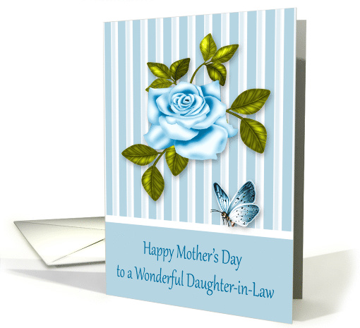 Blue roses symbolize mystery and the impossible, as well as extraordinary beauty. A lovely Happy Mother's Day card addressed to a wonderful daughter-in-law. The design highlights a beautiful blue single rose accented with a delicate butterfly on a striped background with dark blue text. Original design by Laurie Schneider, elements by Digital Designs by Elena