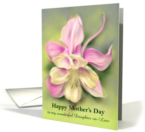 A pastel pink and cream columbine flower graces the front of this Mother’s Day card along with coordinating green text that may be personalized for a daughter-in-law or any recipient. This lovely wildflower, also called Aquilegia, blooms in spring and early summer.
