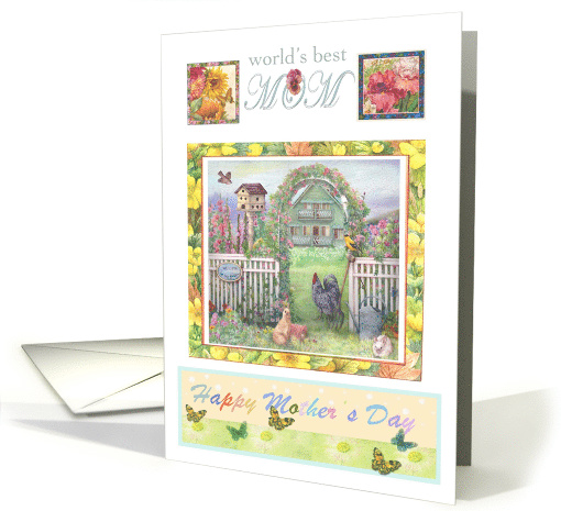 Detail watercolor, celebrating the natural world around us.Mother's day greeting for your daughter in law. Cozy cottage nestled in the garden,with charming critters & birds.Painting of pets in garden by judith cheng
