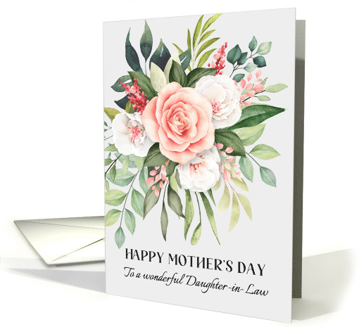 Modern Mother's Day Floral Bouquet with hand-painted coral and white roses and spring greenery on light gray background. This design was created for the wonderful Daughter in Law who brightens your world.